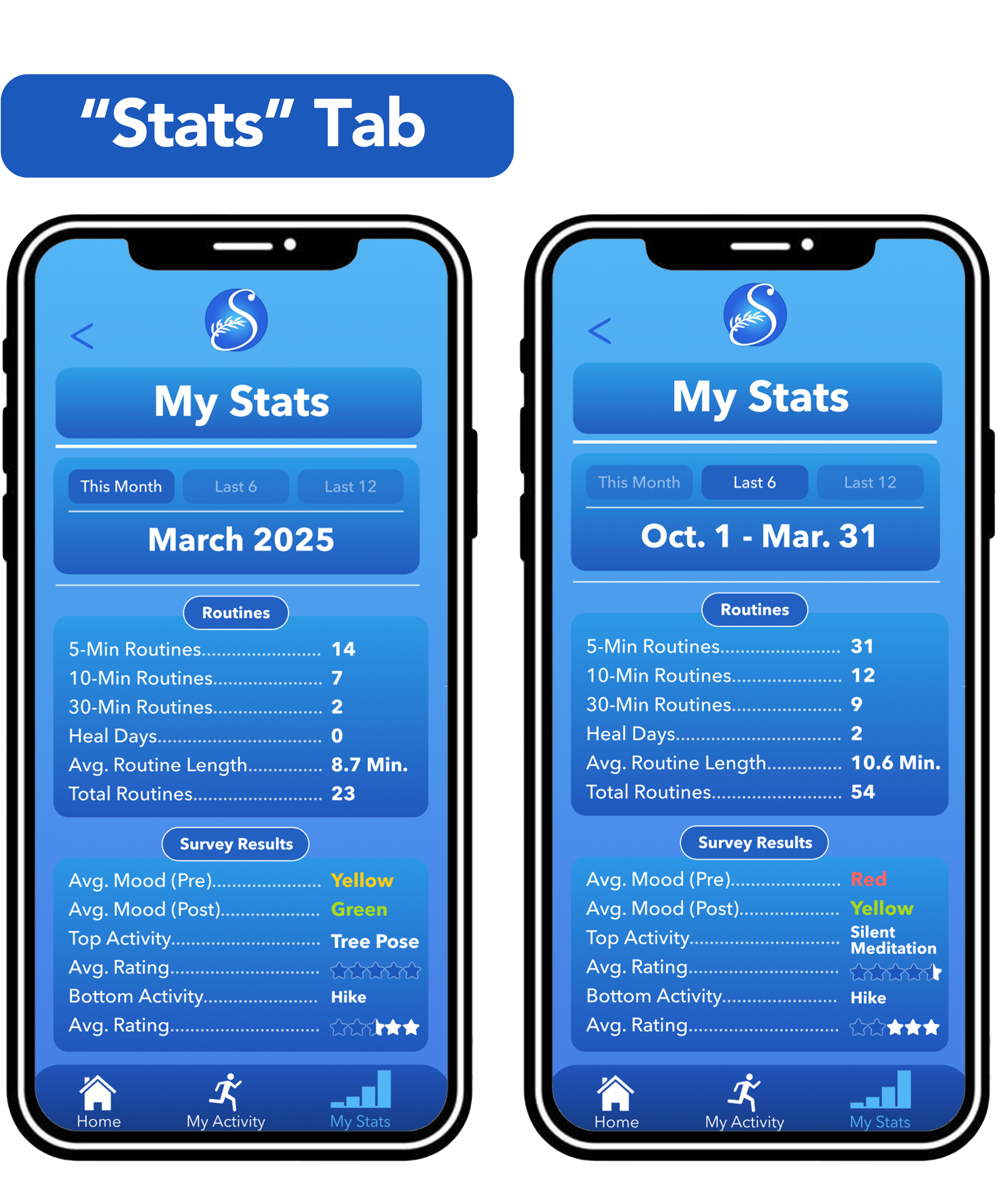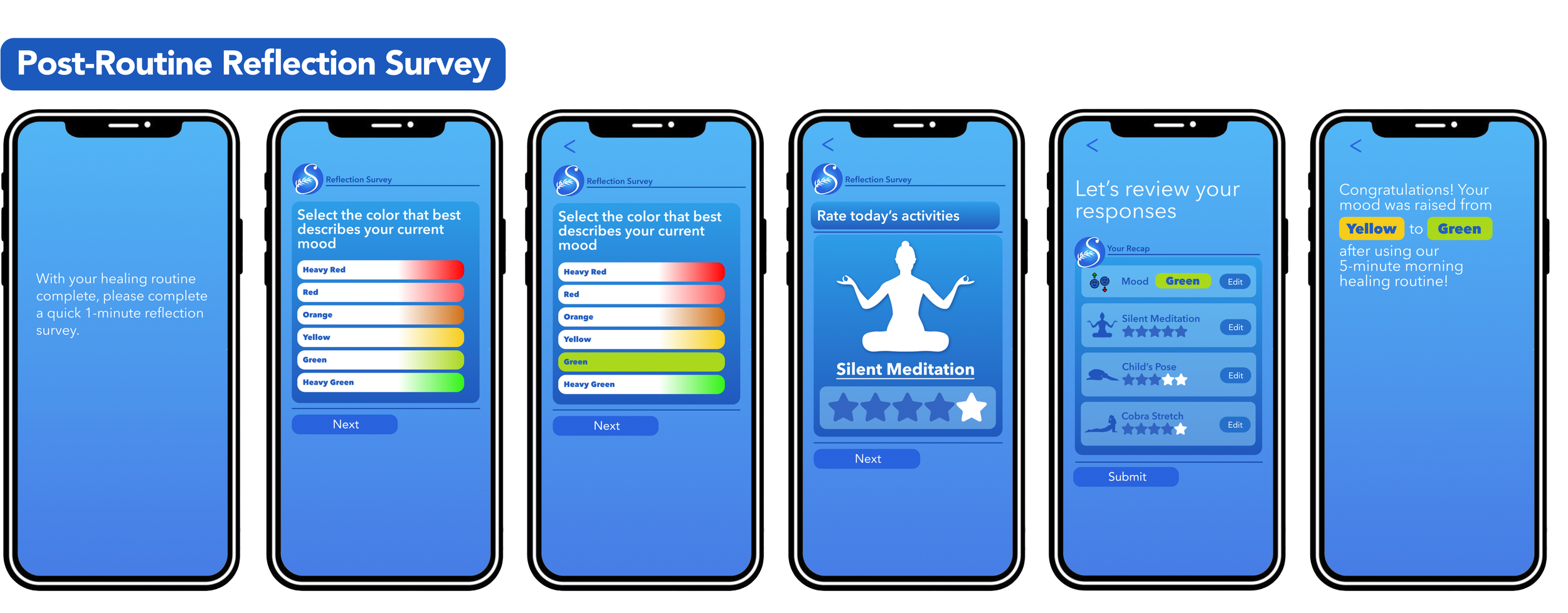 Stable™ offers its users a post-routine reflection survey, with some repeating questions from the opening survey and other new ones specifically pertaining to the exercises and activities the user has just performed. This survey is used to help gauge which activities correlate most with a boost in mood. Activities that users rate the lowest or report having a stagnant or worsened mood after performing will be less likely to appear in future recommended routines.