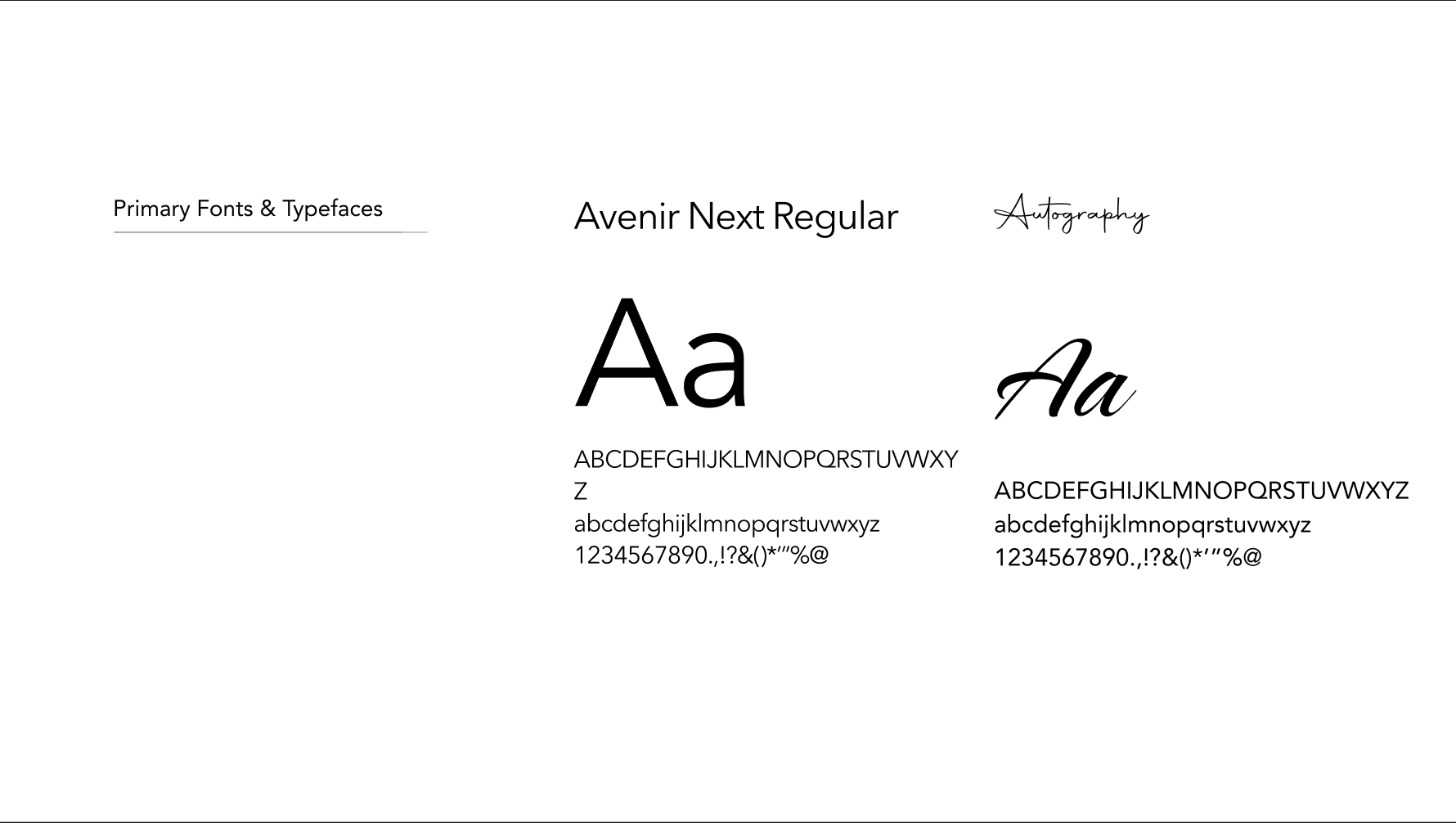 I opted to use the sans serif Avenir Next and its various available weights as my project’s primary font and the script, handwriting-esque Autography as a complementary garnish of a secondary font.